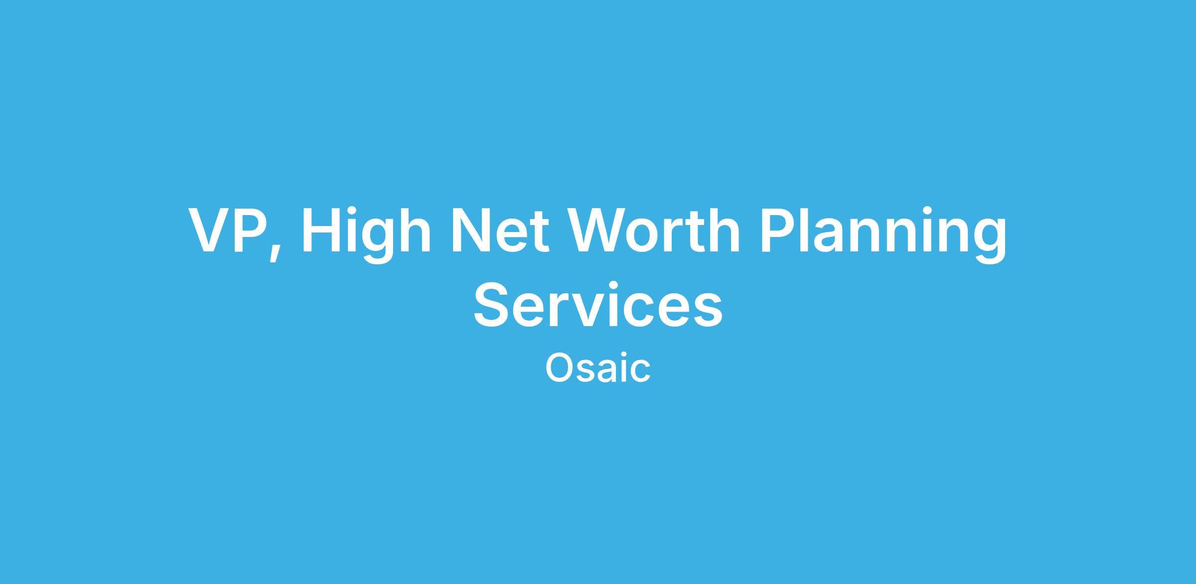 The Vice President of High Net Worth (HNW) Planning Services is a strategic leadership role responsible for supporting Osaic Financial Professionals in delivering sophisticated, customized financial planning solutions to HNW and Ultra-HNW clients (net worth $10M+). This individual will lead a team of Senior Financial Planning Specialists to deliver high-quality, financial planning solutions. The VP also serves as a thought leader within the organization, driving innovation and excellence in wealth planning services while contributing to the firm’s strategic vision.